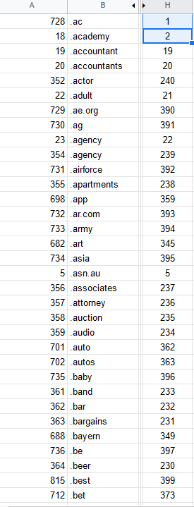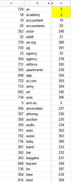 Once you have dragged all the way to the bottom and released the handle your domains will be have the database order column (Column H) in sequential order, assuming the domain name column (Column A) was ordered alphabetically as well.